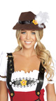 The four-piece Beer Stein Babe costume includes a high waisted romper with suspenders, peasant top with applique, detached sleeves and beer girl hat. Stockings not included.