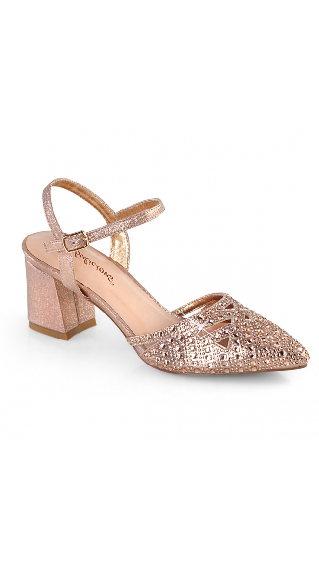 Put your best shining foot forward in these cute and functional shimmer pumps featuring a rhinestone studded pointed toe, an open back ankle strap, and a 2 3/4 inch block heel.