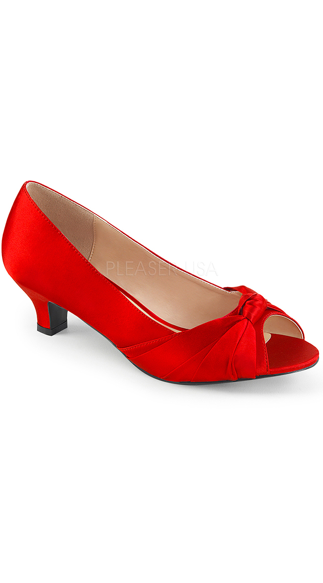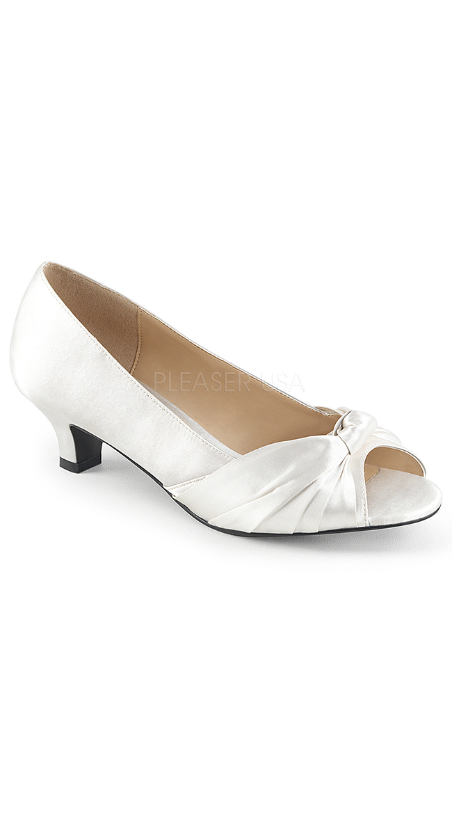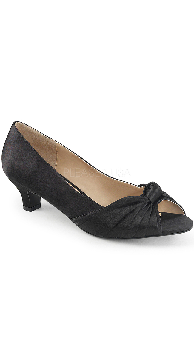 Embrace sophistication in this classic satin pump featuring a satin knot detailing, an open toe, and a 2" kitten heel.