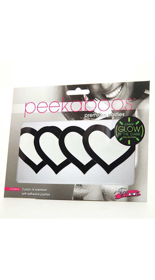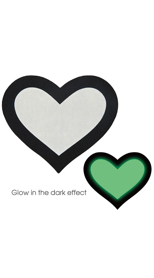 Fall in love with these cute pasties featuring two pairs of premium self-adhesive pasties. Both sets feature an outlined heart shape. When glowing in the dark, these cool pasties turn green! Gently peel off and store away for multiple uses.