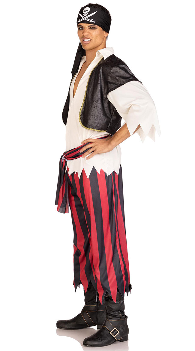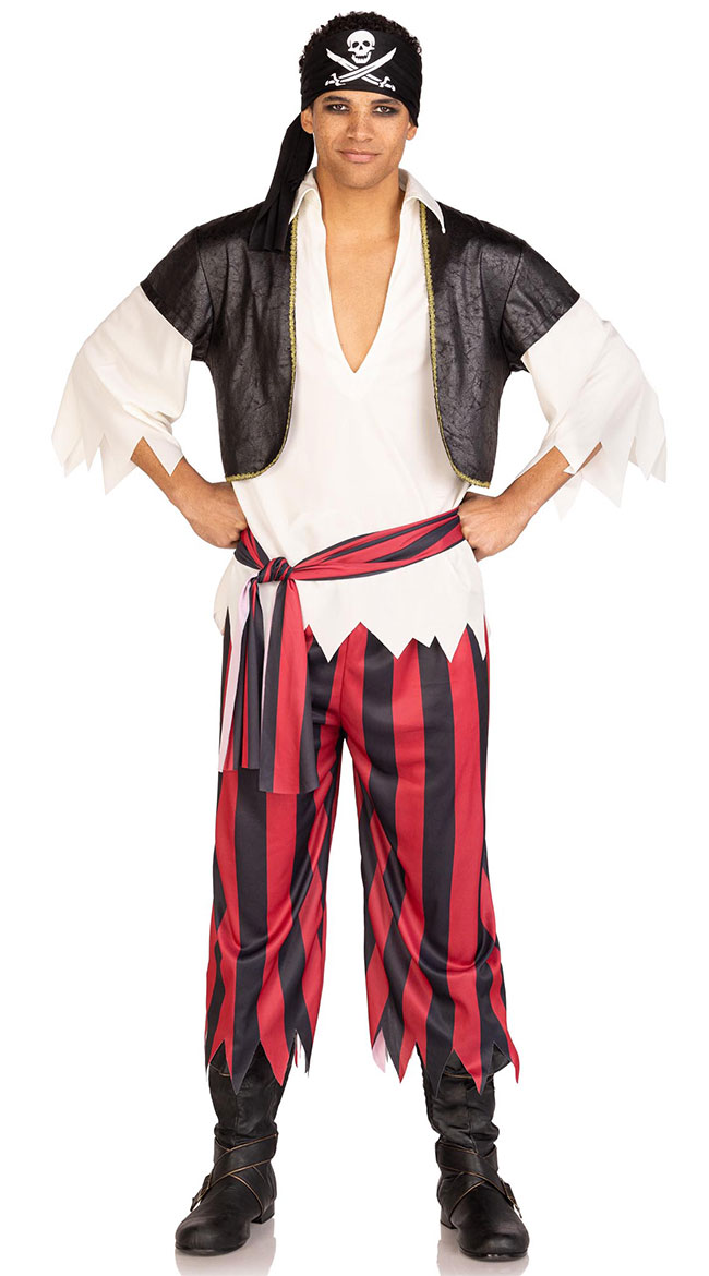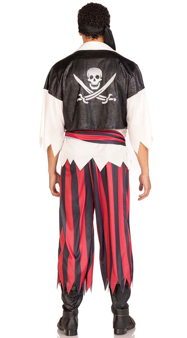Pillage and plunder in this men's Jolly Roger Pirate costume featuring a white peasant top with a jagged hem, a V-neckline, 3/4 length sleeves with a jagged trim, a black bolero jacket with a gold trim, short sleeves, a white skull and crossbones back design, a red and black striped waist sash, matching striped pants with a jagged trim, a black head sash with a white skull and crossbones design. (Sword not included.)