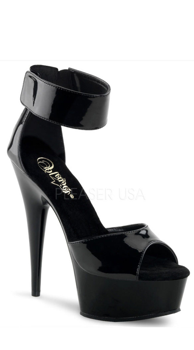 Shine bright in this sexy black sandal featuring a 6 inch heel, a 1 3/4 inch platform, a wide ankle band, and a back zipper.