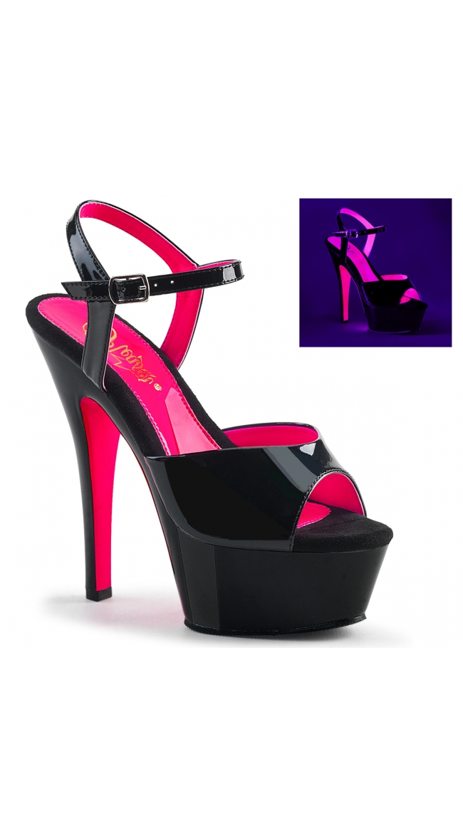Get ready for an electric adventure in these two tone patent sandals featuring an open toe, an adjustable ankle strap, a comfortable insole, a 1 3/4 inch platform, and a 6 inch heel. These sexy sandals have a neon glow under a UV light!