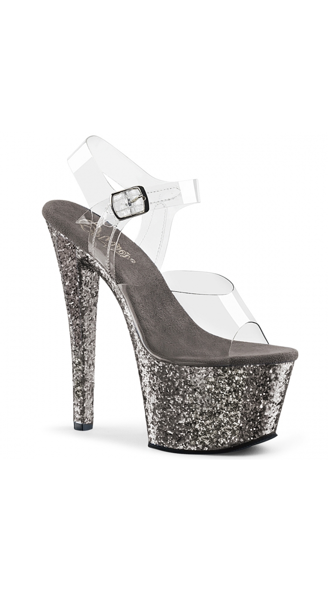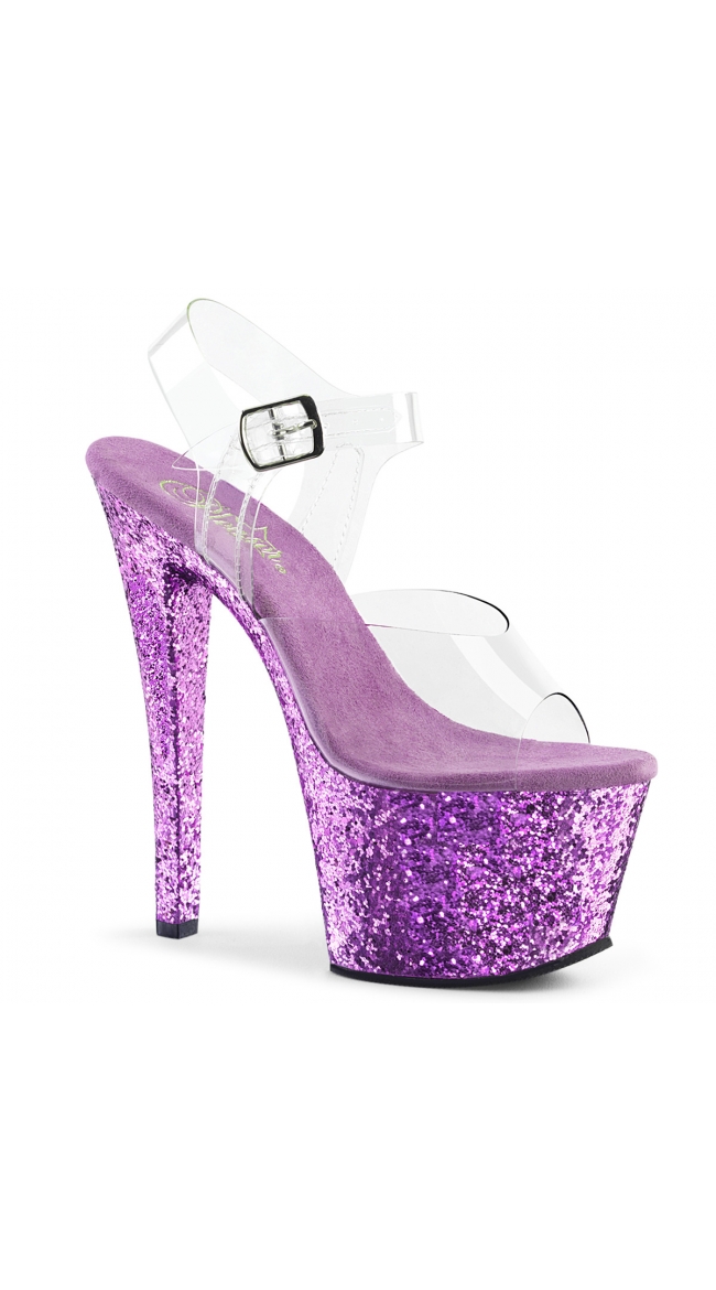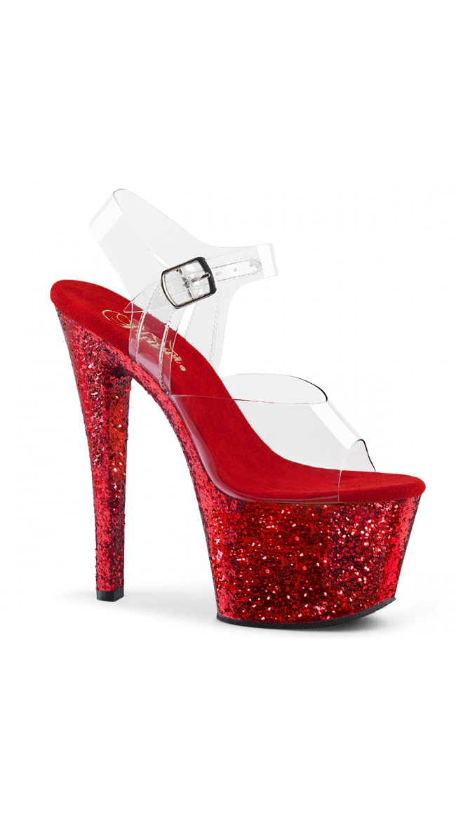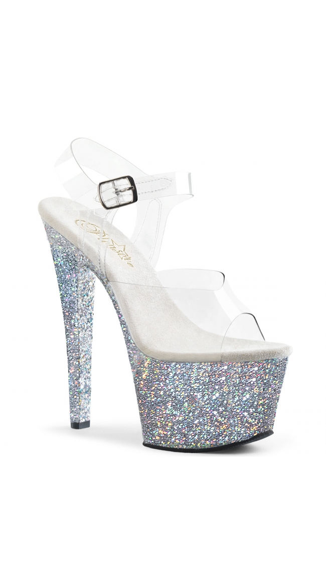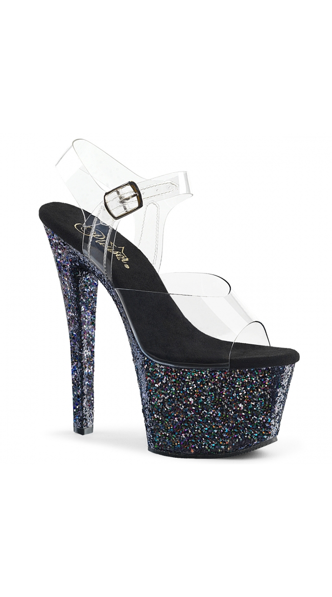 Give your outfit an extra sparkle with these sexy glitter bottom sandals featuring an open toe, a clear band, a clear adjustable ankle strap, a cushioned insole, a 2 3/4 inch platform, and a 7 inch heel.