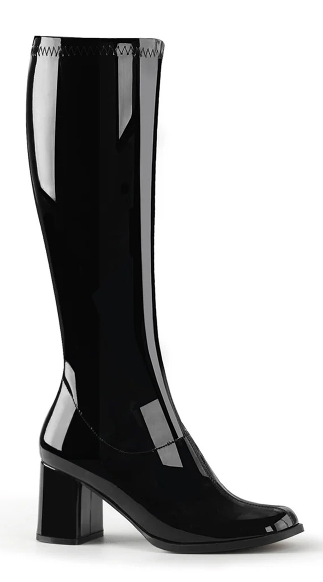 This patent black boot pairs with almost every outfit possible and looks especially sexy when paired with SWAT team and cop costumes. Featuring a 3 inch heel with a slightly squared toe, this boot has plenty of stretch for easy dressing and stops at the knee.
