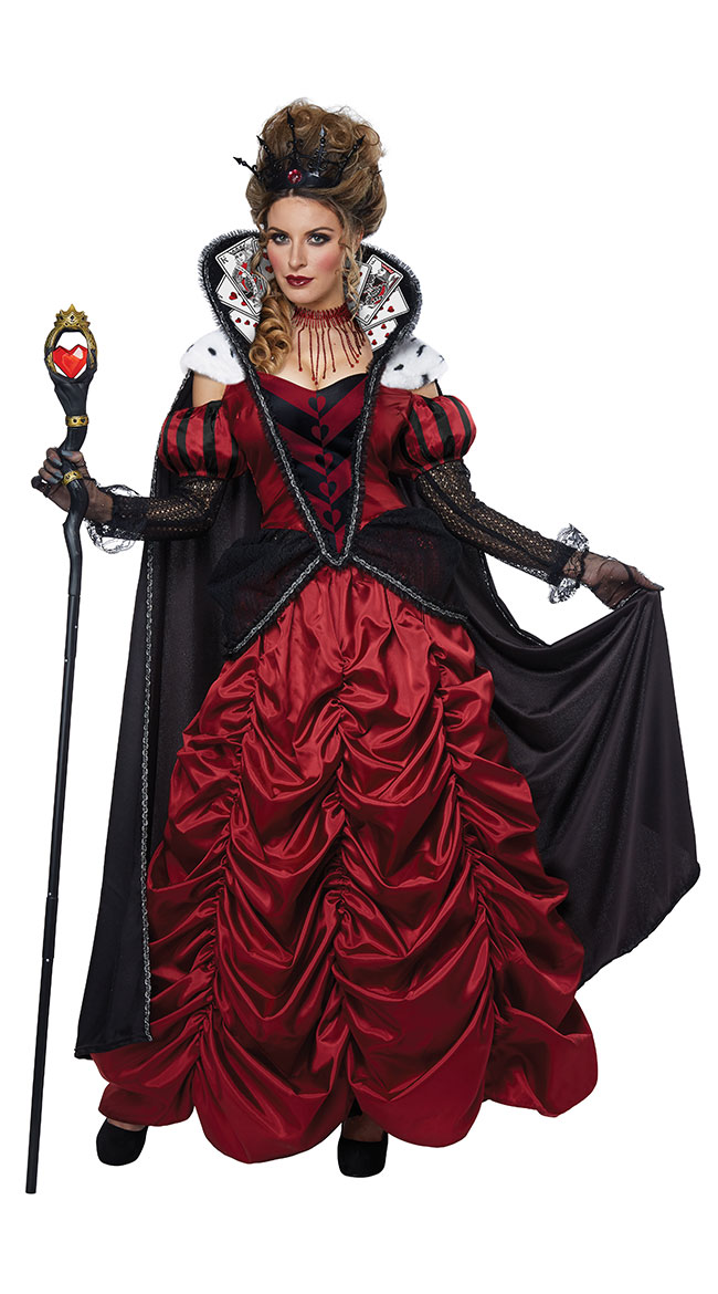 If they don't have a heart, off with their heads! Address the deck in this Dark Queen Of Hearts costume featuring a floor length satin gown with a sweetheart neckline, a black and red striped bodice with heart details, a red velvet torso, white and black faux fur shoulder pads, black and red striped puff sleeves, attached black fishnet sleeves with ruffled lace cuffs, a black velvet peplum skirt, silver embroidered detail, a ruched tiered skirt, a tall black collar with card accents, a floor length black cape silver embroidered trim, and a black spiked crown with red jewel. (Scepter not included).