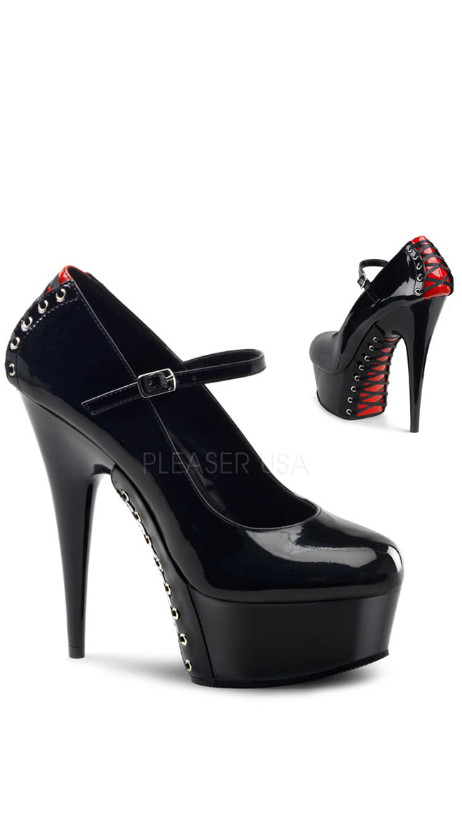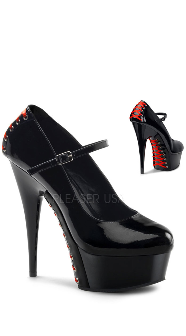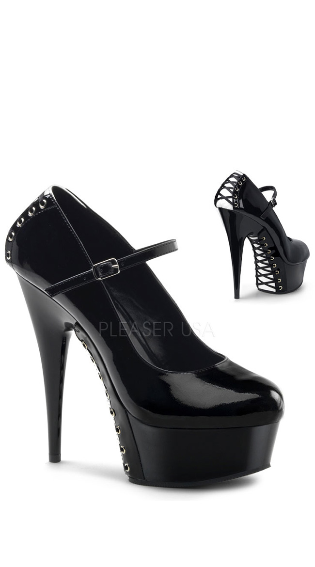 A sexy pump with 6 inch heel, 1 3/4 inch platform, and corset back detail. Wear with a corset for a themed look or with a dress for a sexy added detail.