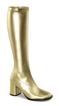 This gold Go-Go boot is perfect for your next 70s party! It features a 3" block heel, a stretch fabric, and a full inner side zipper.