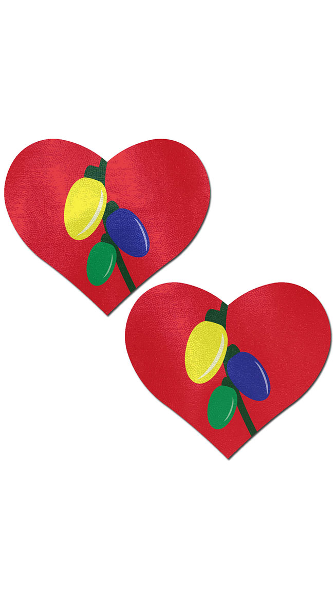 Show some sassy holiday spirit in these red heart pasties featuring colored holiday lights, and a latex-free, medical-grade, waterproof adhesive that will stay securely in place until gently removed.