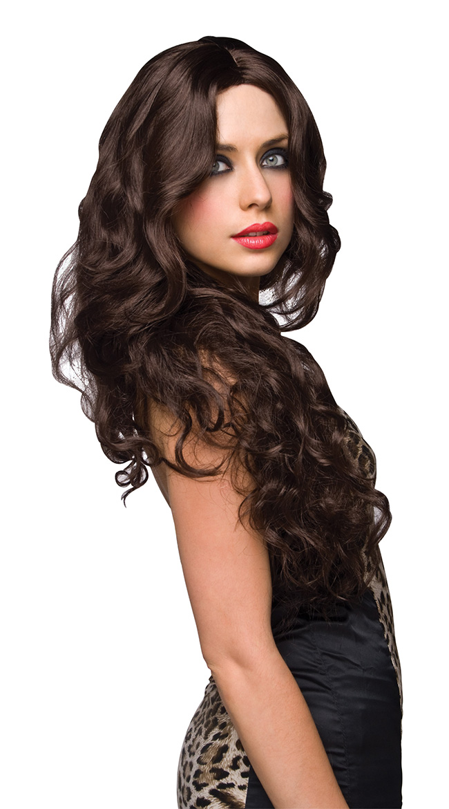This long, brown wig features a center split, no bangs and tousled curls.