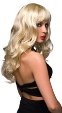 This sexy, long, blonde wig features a center split, bangs and layered curls.
