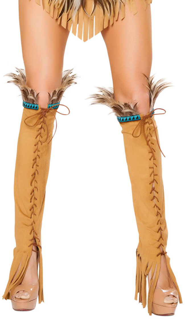Complete your costume with these suede leg warmers featuring an intricate design on the hem, feather accents, a lace-up front closure, and a fringe trim. (Leg warmers only.)