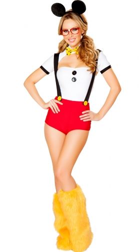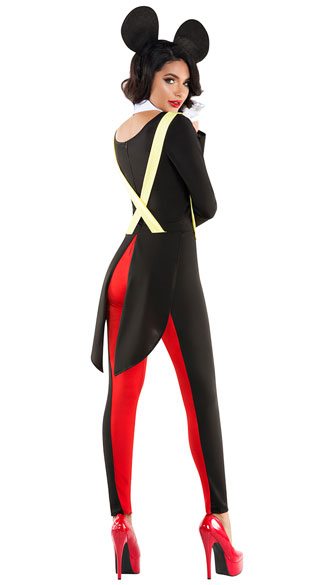Party at your clubhouse in this Sexy Mick Mouse costume featuring a black catsuit, v-neckline, attached shirttails, red front pant accents, yellow suspenders, button details, white and black striped bodice, matching neckpiece, and black oversized mouse ears. (Gloves and shoes not included.)