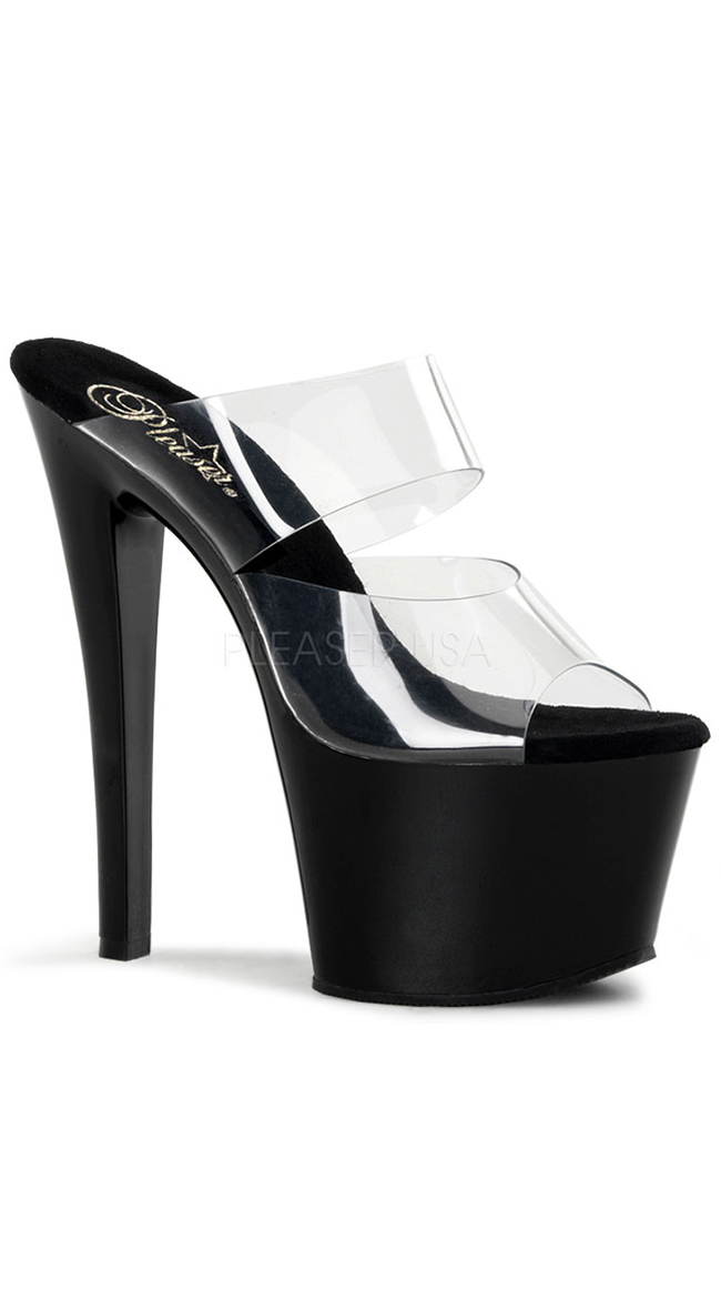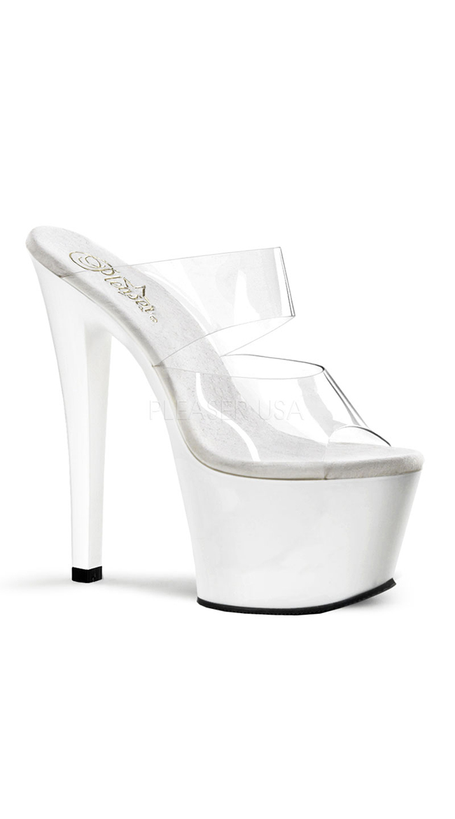 These are the perfect shoe for me, I wear 7in boots to the club and I wanted to switch to a more delicate look and slides are the perfect shoe for that look (I got the black & clear) I was worried about not being able to walk in slides since they don’t have much ankle support but these are perfect with the second strap to help keep the shoe secure and comfortable! I wear a size 9 and I sized up to a 10 (sizing up doesn’t give you MUCH more width just a little extra toe space) . I do always have to blow dry plastic heels to loosen them up to get them on or else they are too stiff and tight to even get into, but after doing that they were so comfortable and easy to wear! They just need a bit of breaking in before I wear them to work, so the plastic doesn’t cut into my feet. I am really happy with this pair if you are wanting to switch to slides these are the way to go for sure!!! 10/10 (sky is always an elegant look since the heel has a flat inner side facing the platform opposed to rounded like adore) ALSO I GOT THESE ON A GREAT SALE!!! Yasss