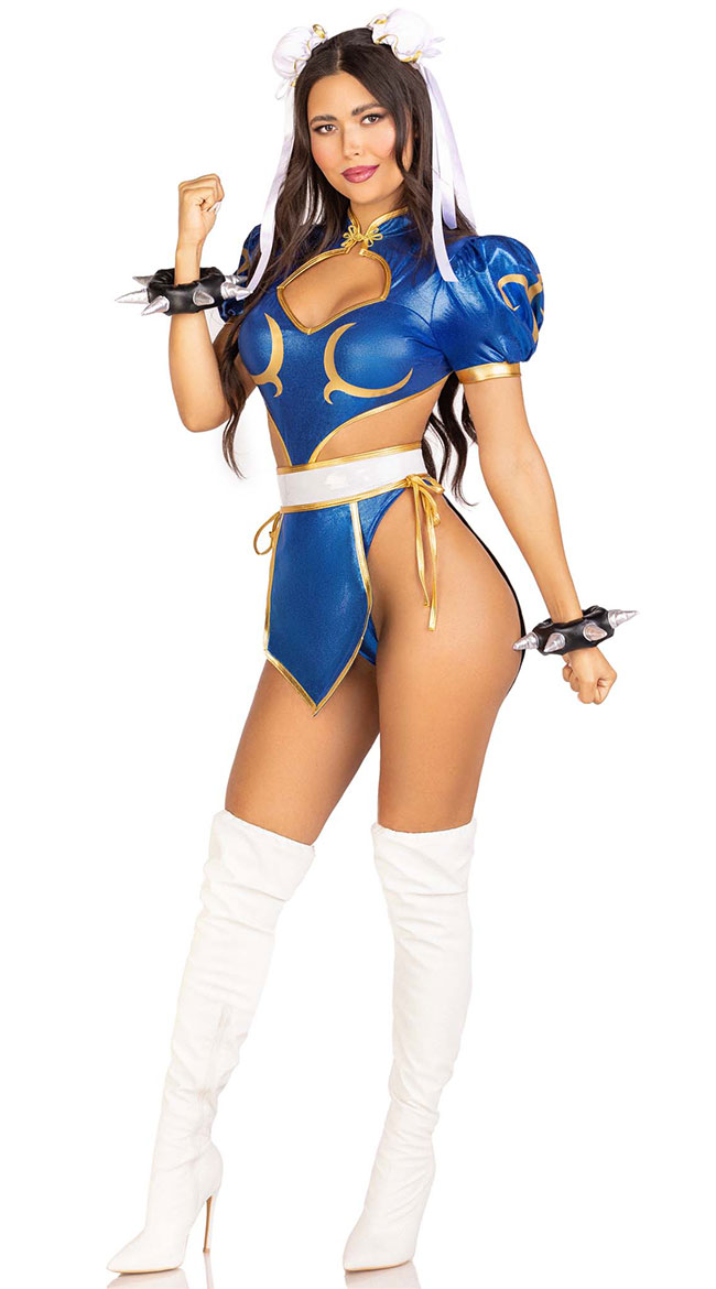 Go for a fatality in this Battle Chin-Li costume featuring a shimmering blue bodysuit with an open, gold-trimmed neckline panel, a high collar with gold closure, a padded bust, puffed sleeves with gold cuffs, an allover gold pattern, open sides and back, a high cut leg, a high cheeky cut back, a white waist belt with a gold trim with side ties, black and silver spiked bracelets, and white bun covers with draping pieces.