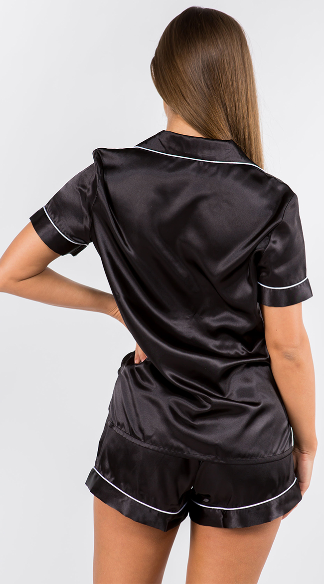Cozy up under the covers in this satin pajama set featuring a shirt with short sleeves, a front pocket, white button closures, a white trim, and matching shorts with an adjustable waistband and full back.