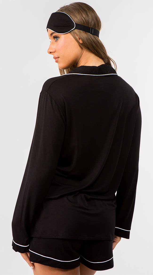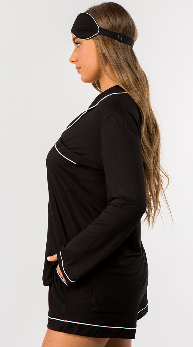 Get the perfect beauty sleep in this cozy pajama set featuring a loose shirt with long sleeves, white button closures, white stripe detailing, matching high waisted shorts with comfortable full coverage, and a matching eye mask.