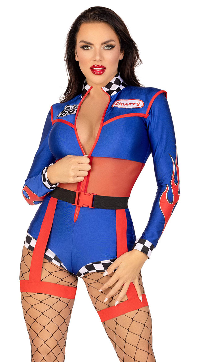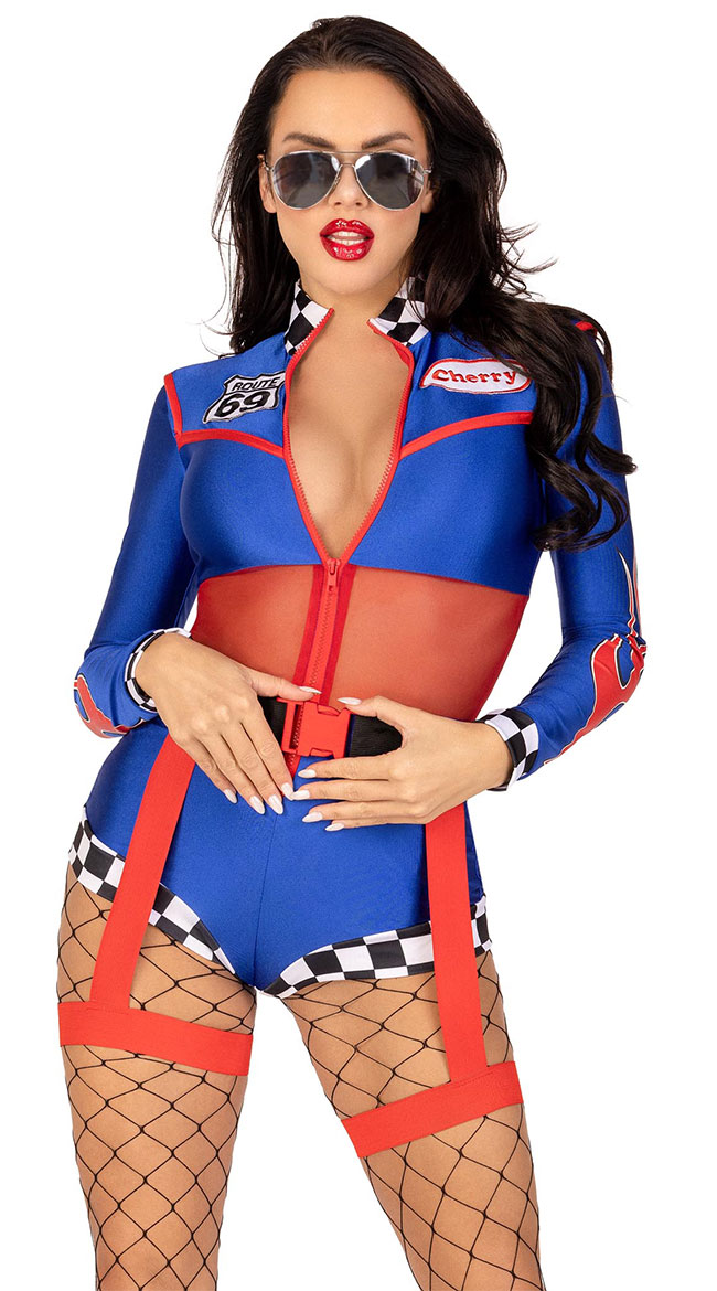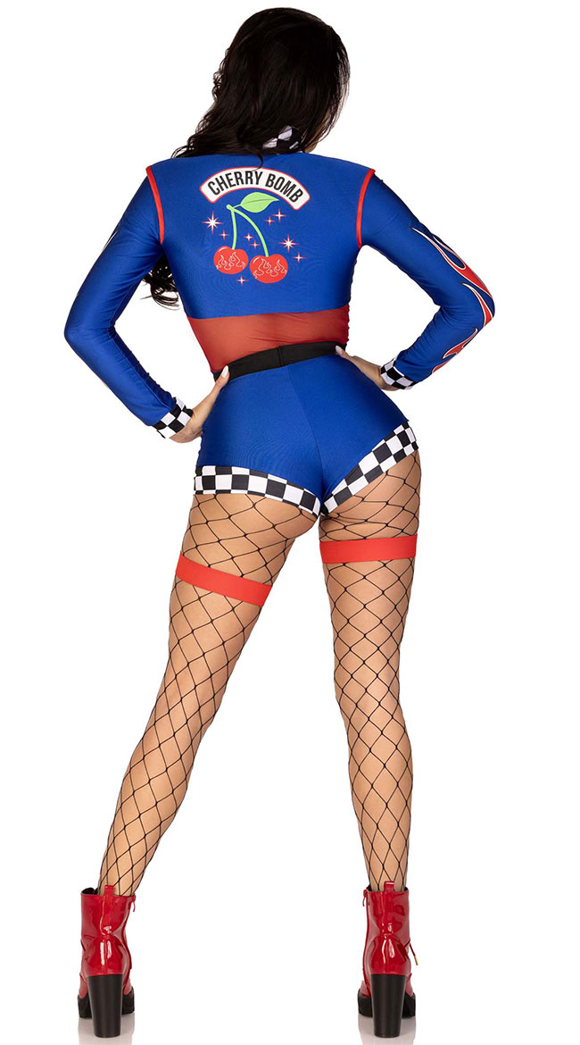Hit the pedal to the metal in this Cherry Bomb Racer costume featuring a blue bodysuit with a high checkered neckline, long sleeves with checkered cuffs and flame print, "ROUTE 69" and "Cherry" patches, a sheer mesh bodice panel, a front zipper closure, "CHERRY BOMB" and cherries back patches, a cheeky cut back with a checkered trim, and a black belt with a red buckle closure, red garter straps, and attached wraparound leg garters. (Glasses, flags and pantyhose not included.)