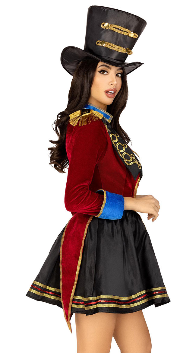 Get the crowd hyped for the big show in this Classic Ringmaster costume featuring a mini dress with a white bodice, a sweetheart neckline with a red and gold sequin trim, a black satin skirt with gold and red sequin stripes, a red velvet tailcoat with long sleeves, blue cuffs, black lapels with gold embroidery, gold fringe epaulettes, and a black top hat with gold embellishments. (Whip not included.)