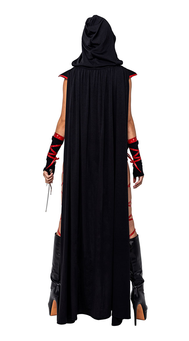 Slink amongst the shadows in this Dragonfire Ninja costume featuring a black bodysuit with wide shoulders, a red trim, a front hook closure, an open bust panel, dragon embroidery, a cheeky cut back, an attached hood, an attached long cape, and attached red leg wraps. (Wrist cuffs and sais not included.)