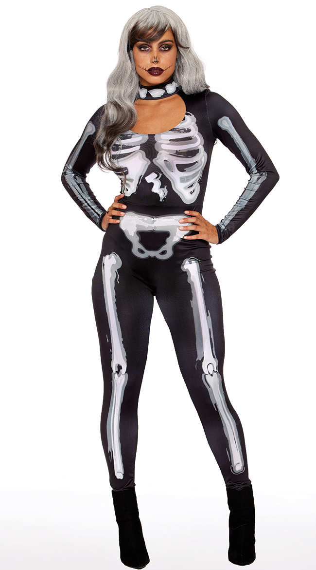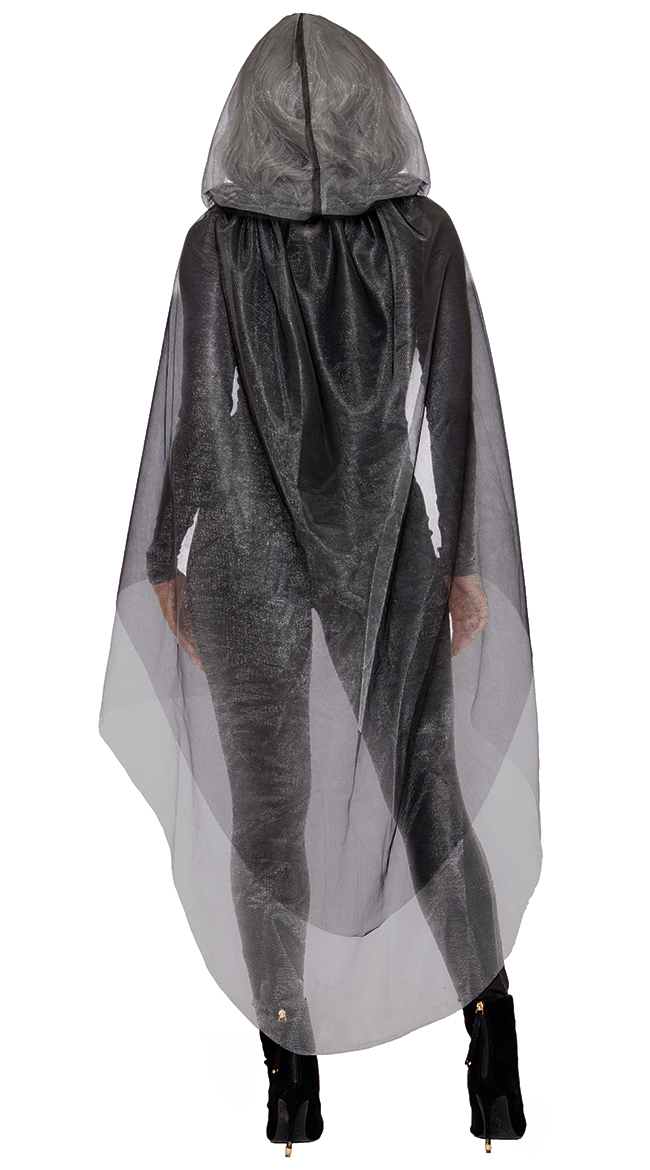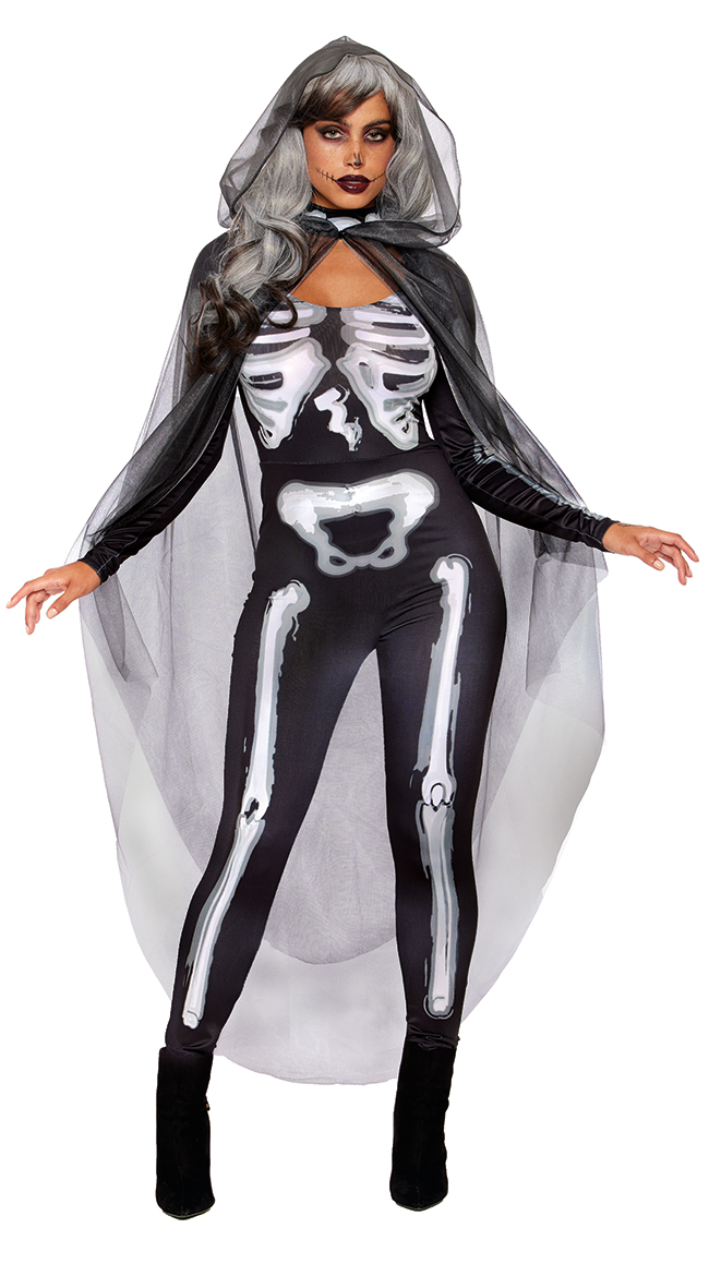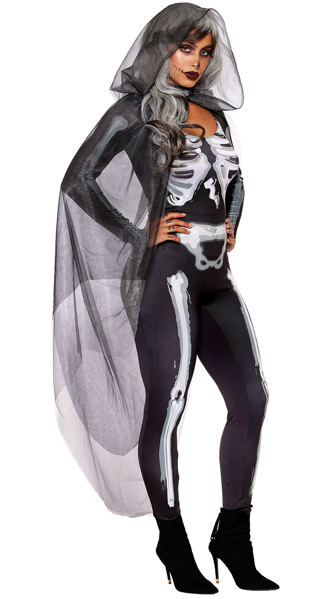 Look hot even from the grave in this Haunted Bones Reaper Costume featuring a black jumpsuit with a scoop neckline, long sleeves, a back zipper closure, a white skeleton print, a fitted leg, and a sheer mesh cape with an attached hood and layered design.
