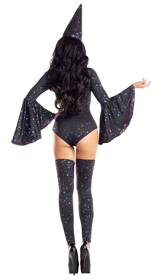 Cast a magical spell in this Mage of Your Dreams costume featuring a black bodysuit with an allover iridescent celestial print, a deep V-neckline with purple lace-up detailing, a purple sequin choker neck with star and moon charms, long bell sleeves with a purple trim, a cheeky cut back, matching footless leg warmers with purple sequin tops, and a matching mage hat headband. (Staff not included.)