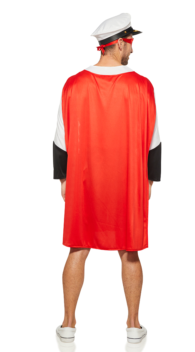 Be the hero of the sea in this Men's Captain Save A Hoe Costume featuring a white shirt with "CAPTAIN SAVE A HOE" printed in yellow, a black female silhouette, long black and white sleeves, blue shorts with allover white "CAPTAIN SAVE A HOE" life preservers, a re cape, a red eye mask, and a matching captain's hat.