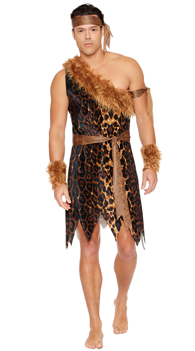 Embrace your bedrock roots in this men's Caveman Costume featuring a leopard printed tunic with a one shoulder neckline, a faux fur trim, a jagged hem, a faux leather belt with a jagged hem, faux fur cuffs, a faux leather headband, and a faux leather armband. (Bone not included.)