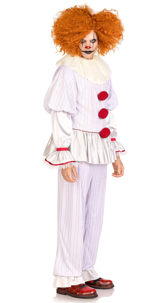 Lure and terrify the masses in this men's Killer Clown costume featuring a striped white top with red pompom accents long shiny sleeves with ruffled cuffs, a ruffled waist, matching pants, and a ruffled neckpiece. (Wig, balloon and hammer not included.)