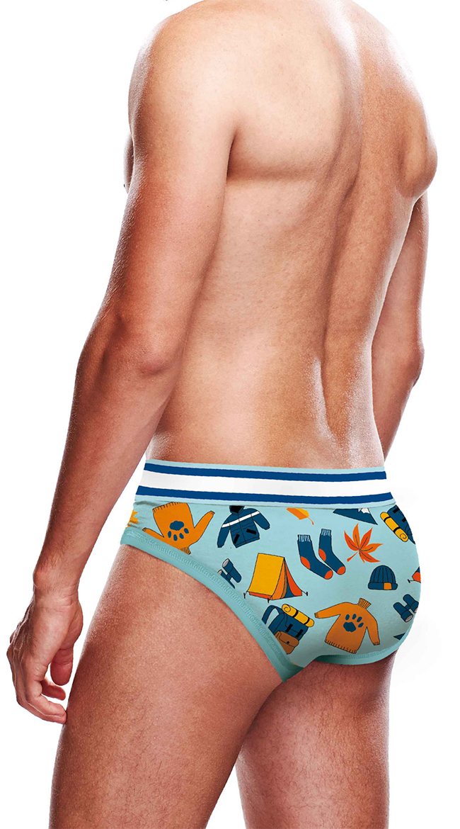Cozy up in these men's blue briefs featuring a white, navy and light blue waistband, a blue pawprint logo, an allover cozy autumn camping print, and a full back.