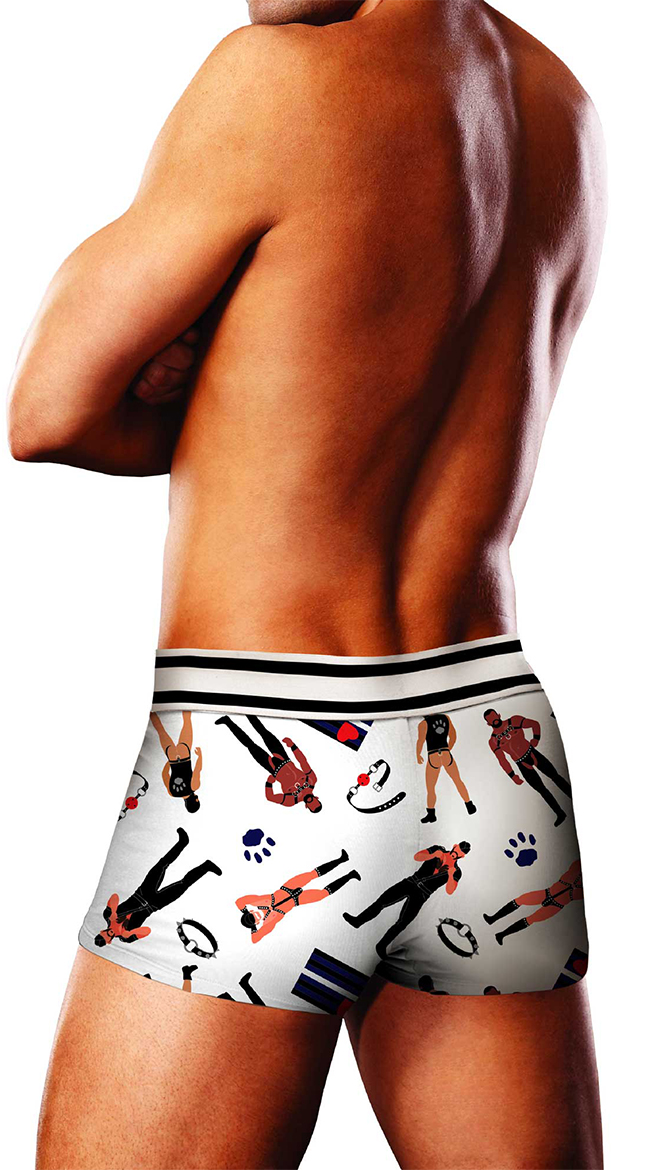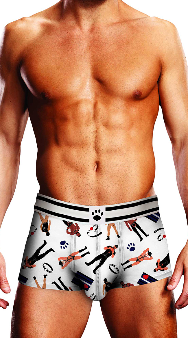 Flaunt your love of your favorite kink in these men's white trunks featuring a black and white striped waistband, a black pawprint logo, an allover leather play design, and a full back.