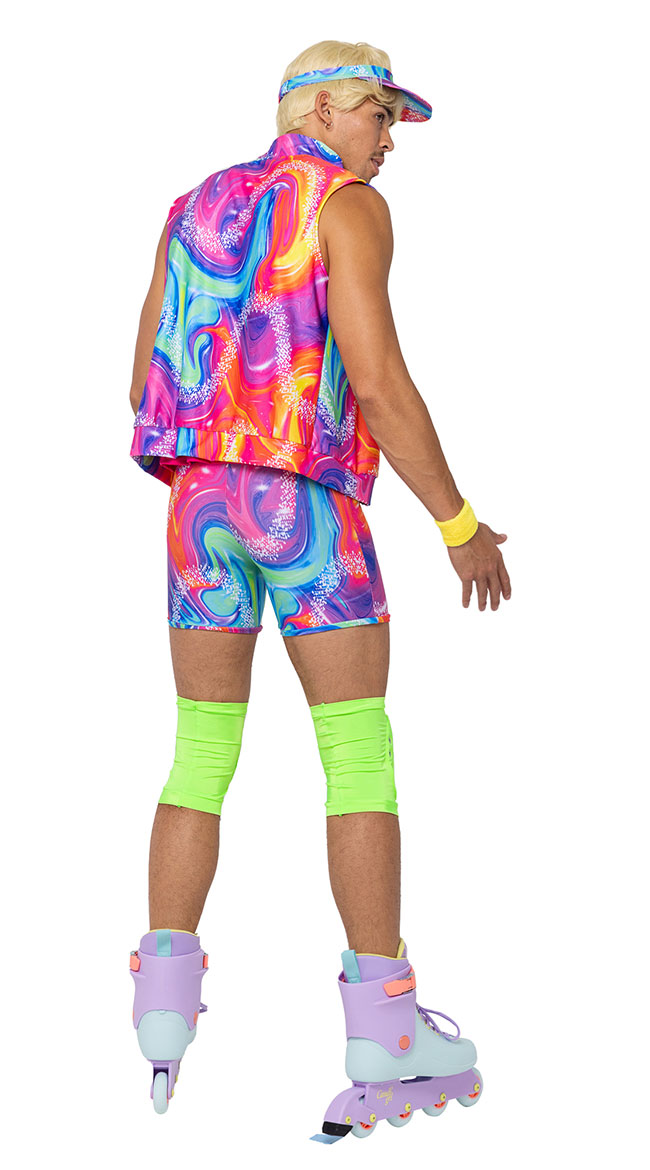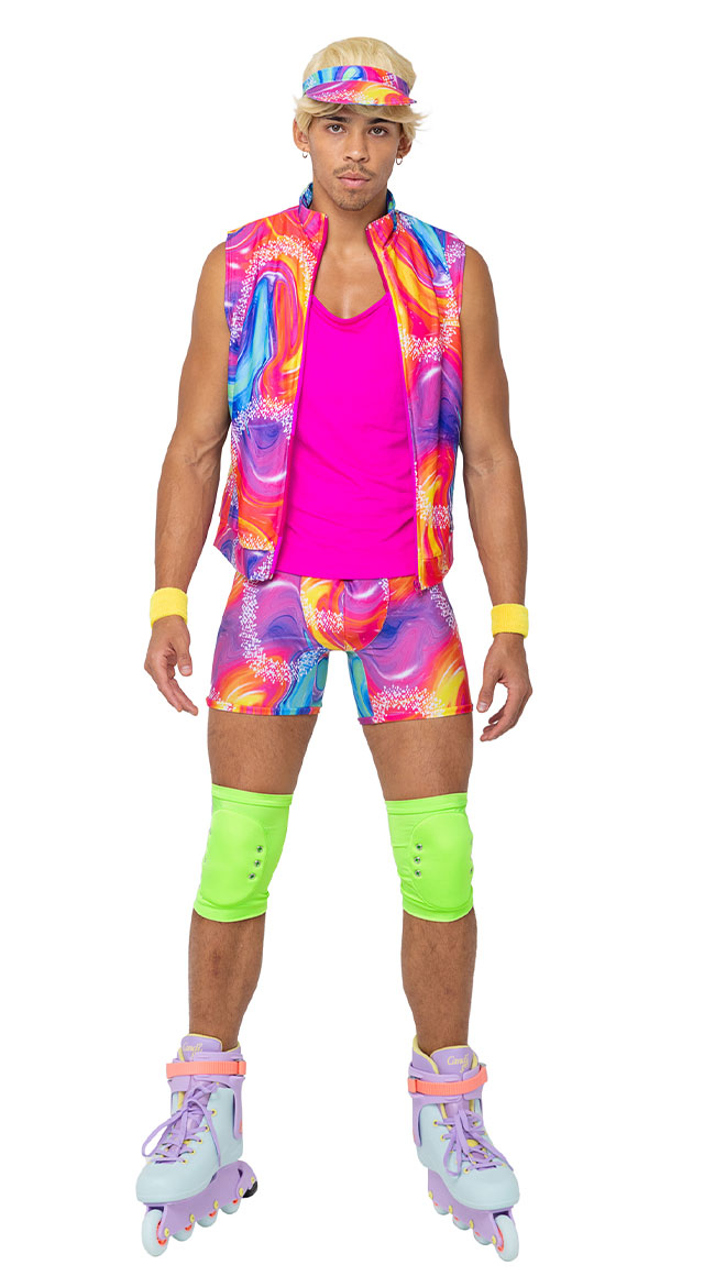 Work the beach in this men's Retro Rollerblade Stud costume featuring a pink tank top with a high V-neckline, a sleeveless tie dye vest w9th a front zipper closure, matching mini shorts, yellow sweatbands, neon green kneepads, and a matching visor. (Rollerblades not included.)