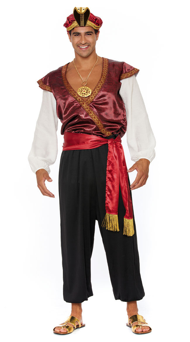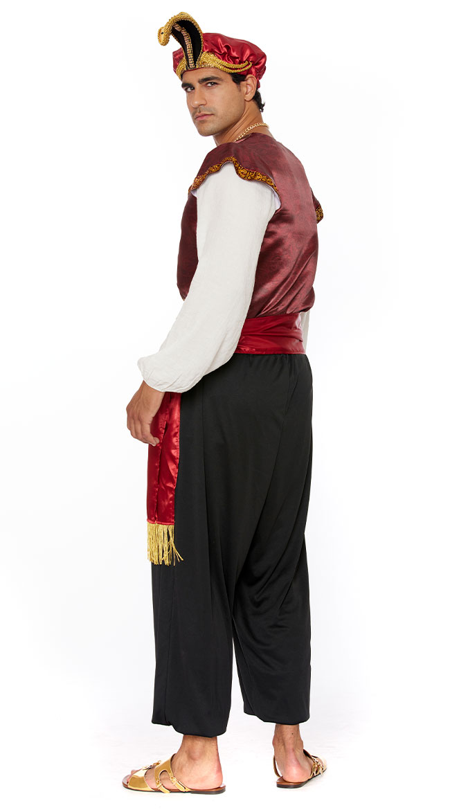 Rule over your people in this men's Sultan costume featuring a burgundy satin top with a faux wrap design, a V-neckline with an intricate trim, white gauze sleeves, a red satin sash belt with a gold fringe, black drop crotch pants, and a red satin turban with a gold trim and snake embellishment. (Necklace not included.)