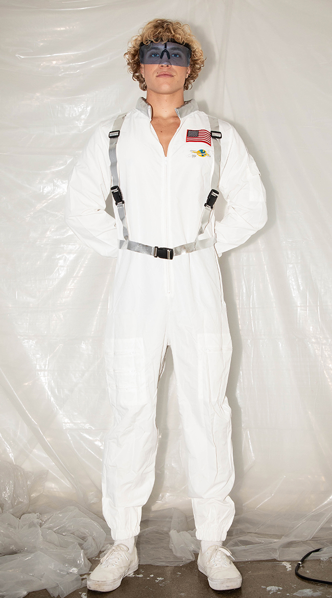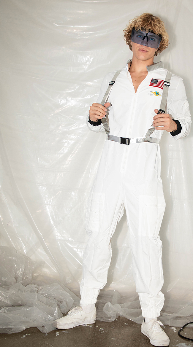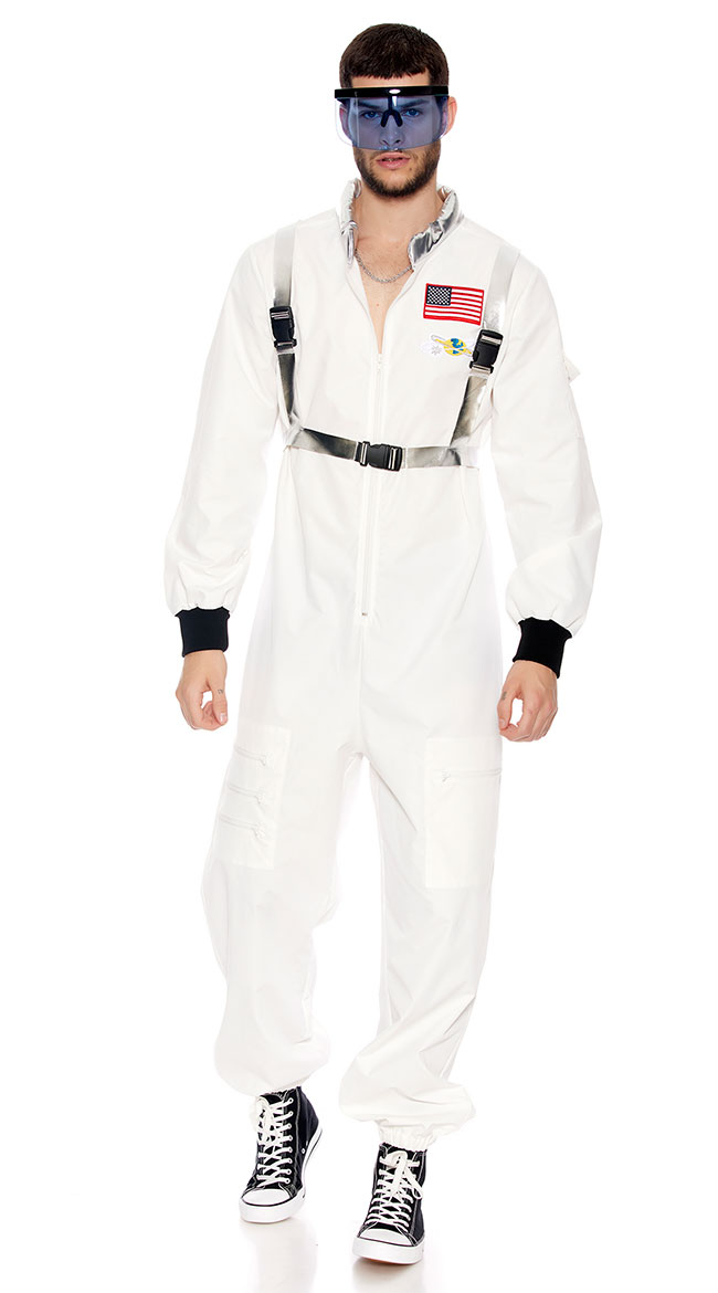 Get ready to moonwalk in this men's Take Off Astronaut costume featuring a silver jumpsuit with a high orange neckline, long sleeves with black cuffs, orange shoulder stripes, flag and space patches, a front zipper closure, black and orange stripes, an orange belt with a buckle closure, and blue visor glasses.