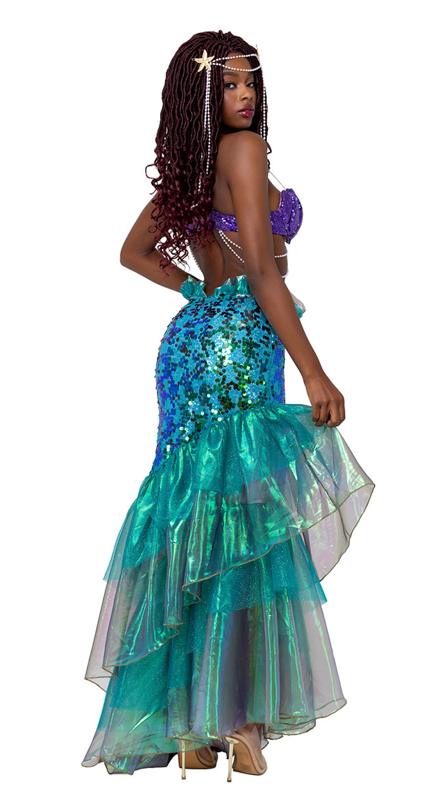 Swim beneath the waves in this Mesmerizing Mermaid costume featuring a purple shell bra with underwire cups, adjustable spaghetti straps, a back hook closure, draping pearl accents, and a high waisted green skirt with a ruffled waistband, sequin detailing, and a tiered flare skirt. (Headpiece not included.)