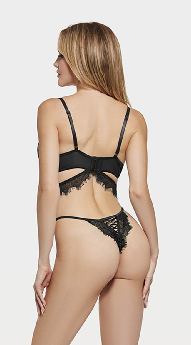 Tease your lover in this sultry bra set featuring underwire demi cups with sheer eyelash lace, strappy detailing, adjustable spaghetti straps, a satin bow accent, a lace underbust with cut-out asides, a scalloped trim, a hook and eye back closure, and a matching strappy panty with a thin waistband, a lace-up back detail, and a thong cut back.