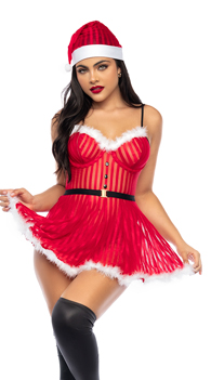 Always be on Santa's good side in this Naughty Mrs. Claus lingerie costume featuring a red, sheer, striped mesh babydoll with underwire cups, peekaboo open panels, a white marabou trim, black adjustable spaghetti straps, black button accents, a black waistband with buckle, a white marabou trimmed skirt, and a matching Santa hat. (Thigh high stockings not included.)