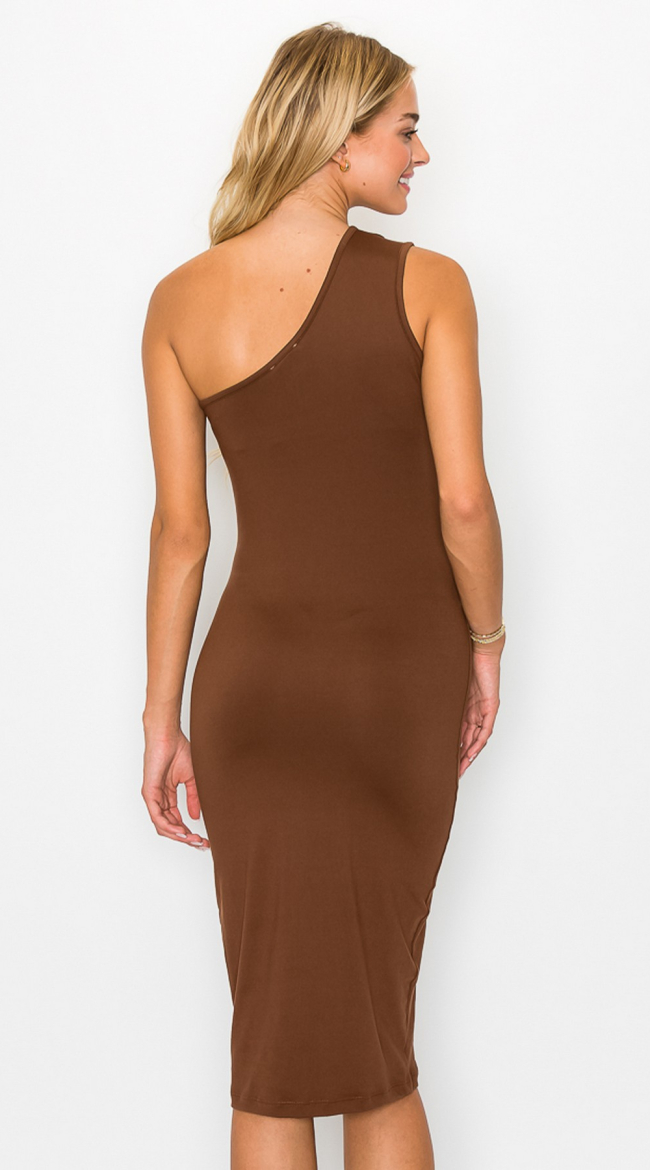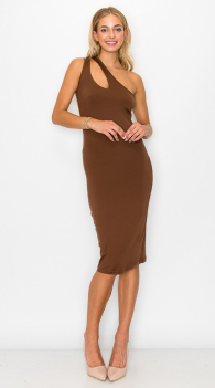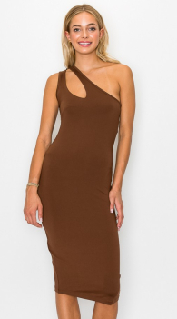 Accentuate your sensual side in this comfy dress featuring a strappy one shoulder neckline, a keyhole cut-out, and a form-fitting, midi-length skirt.