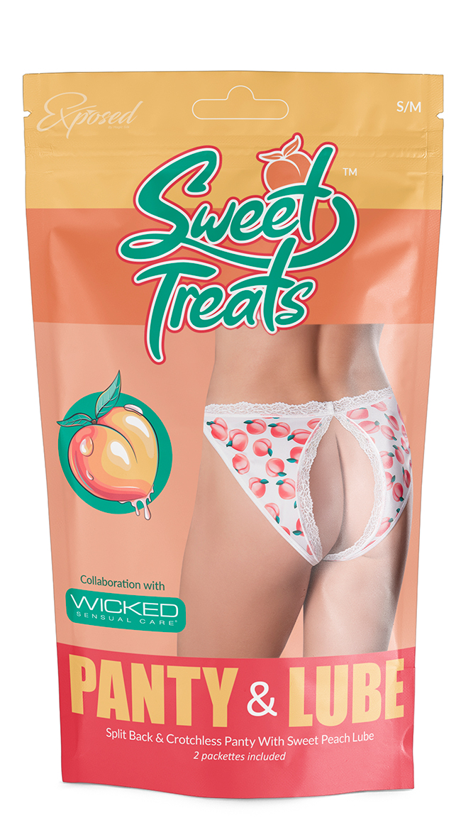 • A silky crotchless panty featuring peach print