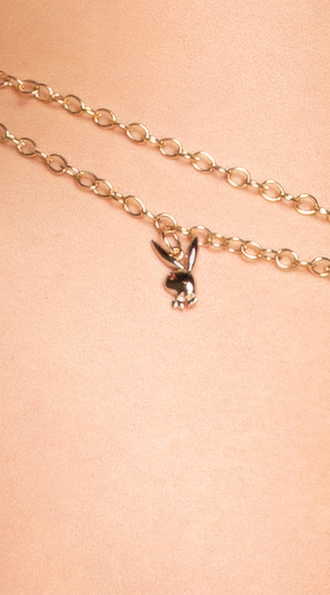 Give your viewers an eyeful in this sultry Playboy teddy featuring open cups with gold chains and gold Rabbit Head charms, adjustable criss-cross spaghetti straps, a sheer mesh bodice with gold chain and charm embellishments, an extreme high cut leg, an open back with adjustable straps, and a thong cut back.