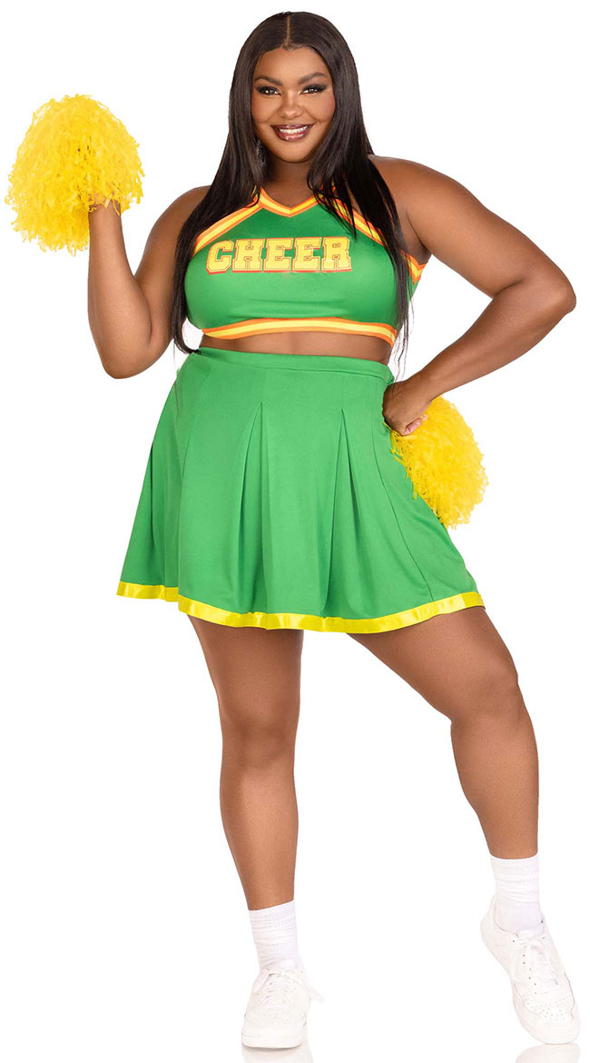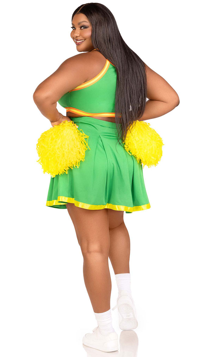 Brr...get ready to bring home the title! Show off your first place moves in this plus size Bring It Baddie costume featuring a green crop top with a V-neckline, a back zipper closure, a CHEER logo across the front, a matching pleated skirt with a yellow hem, and pom poms. (Socks and sneakers not included.)