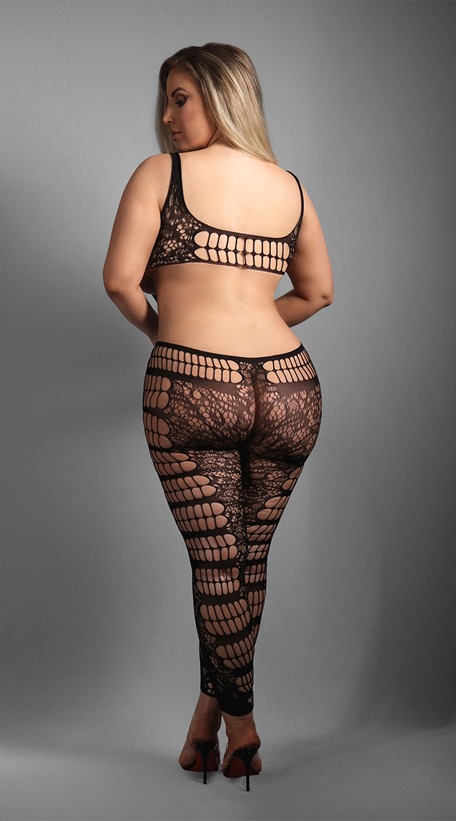 Perfect your seduction in this sexy plus size lace bodystocking featuring a scoop neckline, a sheer but with a fishnet center panel, thick shoulder straps, a fishnet back band, a strappy open bodice with a shredded net trim, and a fitted leg with shredded side panels and an open foot.