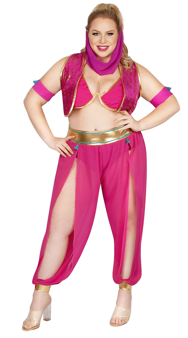 Grant everyone's wishes in this plus size Genie of the Lamp costume featuring a pink bra top with gathered chiffon underwire cups and a gold trim, halter straps, a back strap closure, a cropped velvet vest with gold foil dust detailing and a gold trim, matching harem pants with a thick gold waistband, blue stitching, blue tassels, built-in shorts with a cheeky cut back, gold cuffs, a gold hat with chiffon drape, matching armbands, and a gold lamp purse.