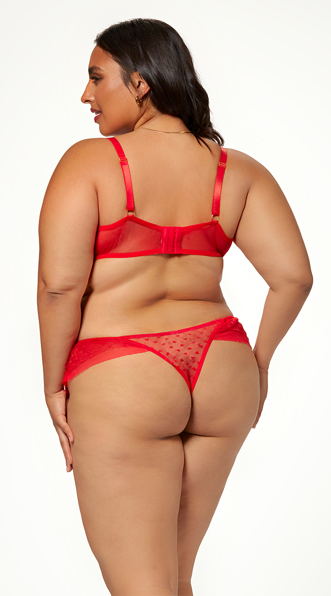 Capture you lover's attention in this sexy plus size bra set featuring sheer tulle underwire cups, a gathered tulle bow, adjustable spaghetti straps, a hook and eye back closure, and a matching low rise panty with allover heart detailing, a ruffled trim, and a thong cut back.