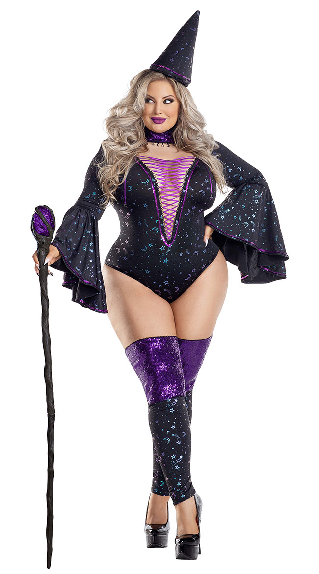 Cast a magical spell in this Plus Size Mage of Your Dreams costume featuring a black bodysuit with an allover iridescent celestial print, a deep V-neckline with purple lace-up detailing, a purple sequin choker neck with star and moon charms, long bell sleeves with a purple trim, a cheeky cut back, matching footless leg warmers with purple sequin tops, and a matching mage hat headband. (Staff not included.)