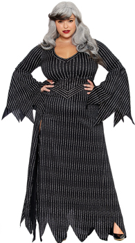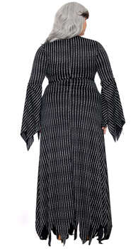 Get into the spooky spirit with this plus size Miss Boneyard Costume featuring a black dress with a soft V-neckline, long bell sleeves with a jagged trim, an allover white bone print with a V-shaped waist, and a long skirt with a jagged hem and a high leg slit. (Wig not included.)