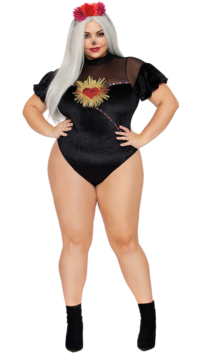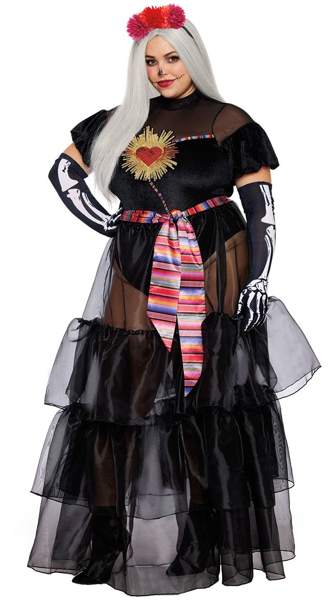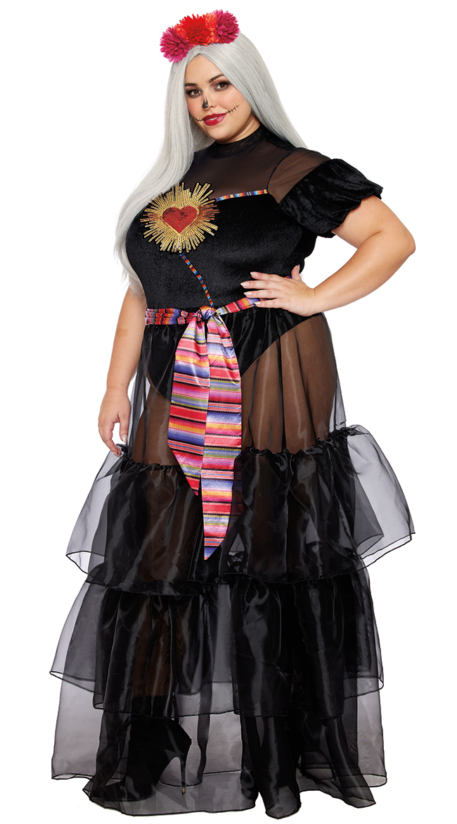 Honor those who have passed in this plus size Miss Muerte Costume featuring a black bodysuit with a high mesh neckline, short fluttered sleeves, colorful piping details, a heart applique with a sunbeam trim, a back zipper closure, a cheeky cut back, a sheer mesh, tiered skirt, a colorful waist sash, and a floral headpiece. (Wig and gloves not included.)