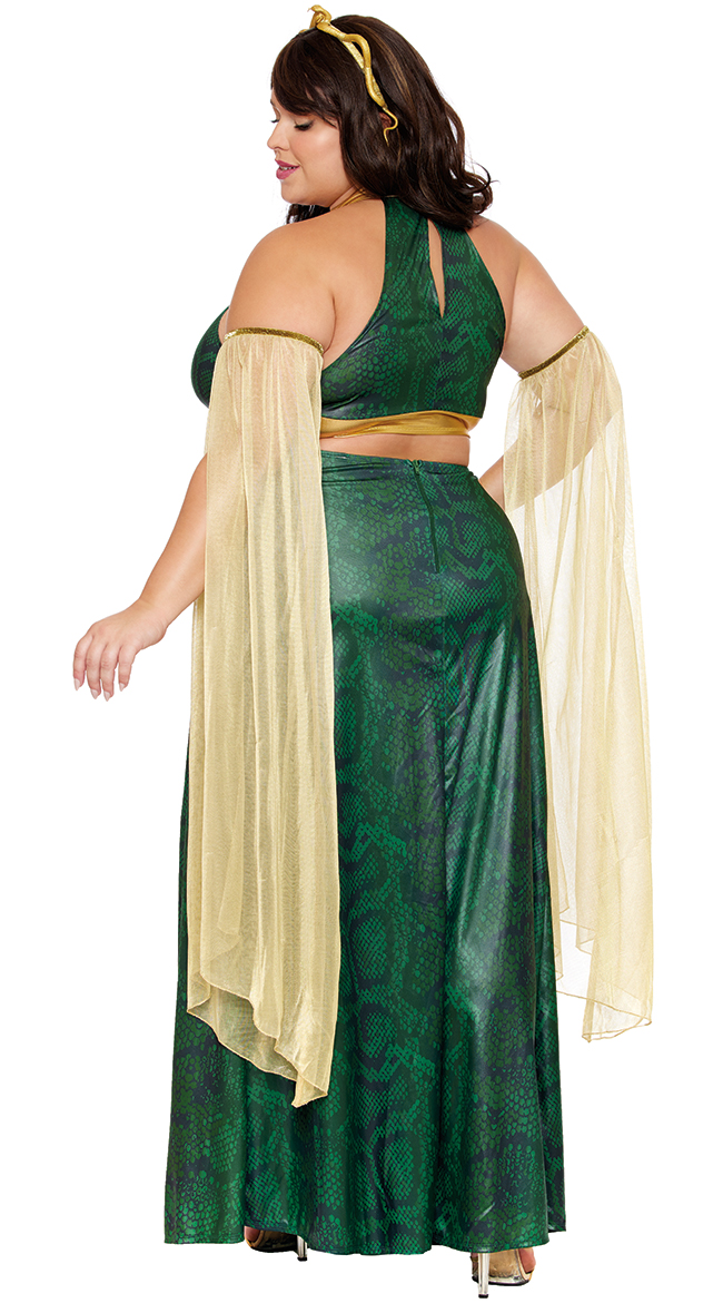 Slither into your next costume party in this plus size Mistress Medusa Costume featuring a green gown with a high gold neckline, a gold trimmed bust with an O-ring, underbust keyhole cut-outs, a high front slit, an allover snakeskin print, detached gold mesh sleeves, and a gold snake headpiece.