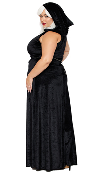 Bring a touch of sexiness to your undead profession in this plus size Ms. Reaper Costume featuring a black velvet dress with a high neckline, a back zipper closure, a high front slit, an attached hood, and a matching beaded belt. (Wig and scythe not included.)