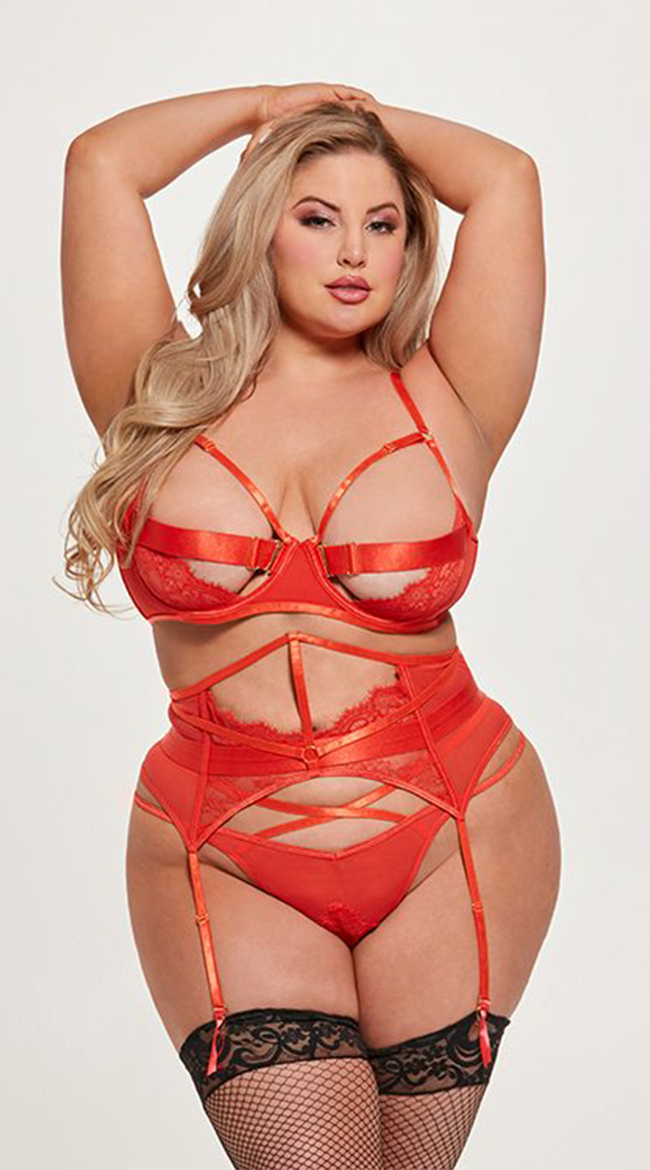 Tempt and tease in this provocative plus size bra set featuring open underwire cups with eyelash lace panels, adjustable straps with hook closures, adjustable strappy detailing, adjustable spaghetti straps, a triple strapped back band with a hook and eye closure, a matching high waisted garter belt with cut-out panels, strappy detailing, a hook and eye back closure, adjustable garter straps, and a matching panty with a strappy waistband and a thong cut back. (Thigh high stockings not included.)